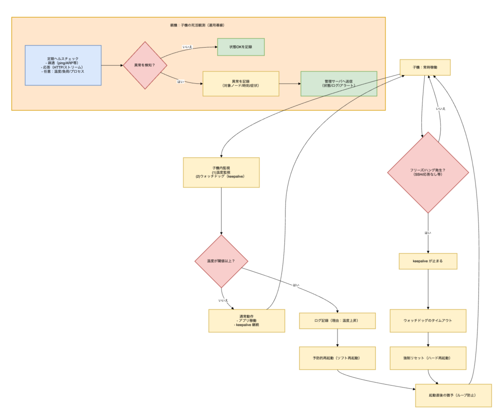 子機が落ちた瞬間、子機は自分で報告できません。そこで親機が 疎通・応答・ストリームを定期チェックし、管理サーバへ状態を送って「運用として気づける」ようにします。
