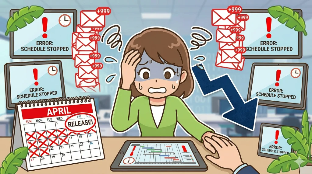 実はその頃、プライベートで急な用事が重なり、勤務を調整させていただくことが増えていました。 休み明けには未読メールが溜まり、目先の返信やタスクをこなすだけで精一杯。この案件は優秀なデザイナーさんに「お任せします!」と言いながら、実は自分の余裕のなさを「信頼」という言葉で誤魔化して、一番大事な「旗振り」を後回しにしていたんです。